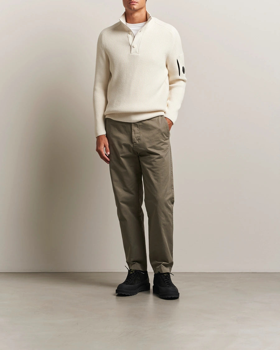 Pull confectionné dans un mélange de coton et de nylon extensible, avec une structure en maille côtelée anglaise. Le tissu texturé offre souplesse et confort. Le pull présente un col côtelé, une fermeture à demi-boutons avec fermeture éclair dissimulée et le logo Lens emblématique C.P. Company. Jauge 7. Coupe classique.