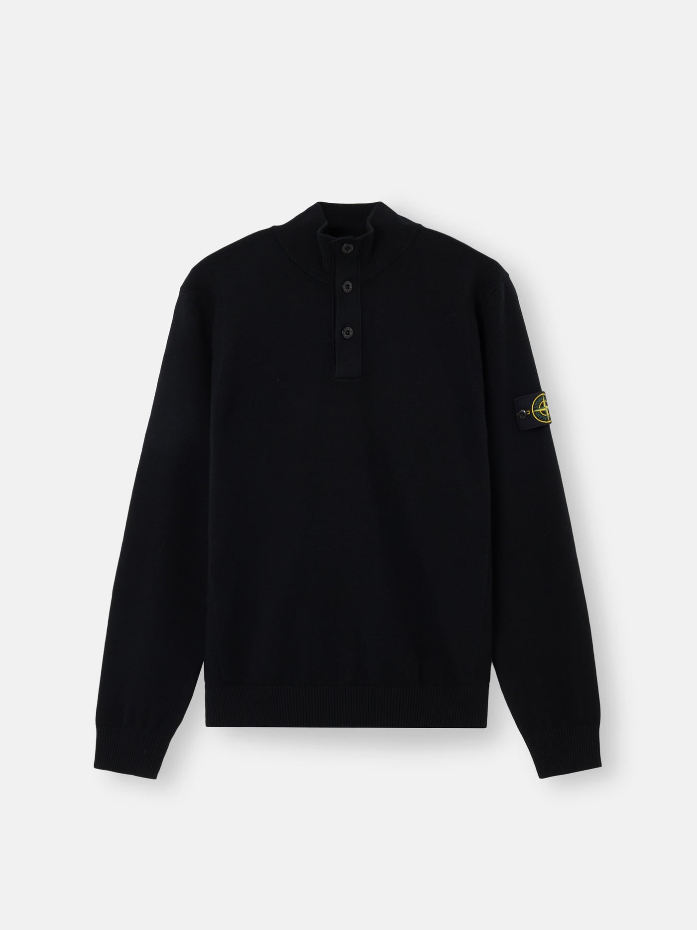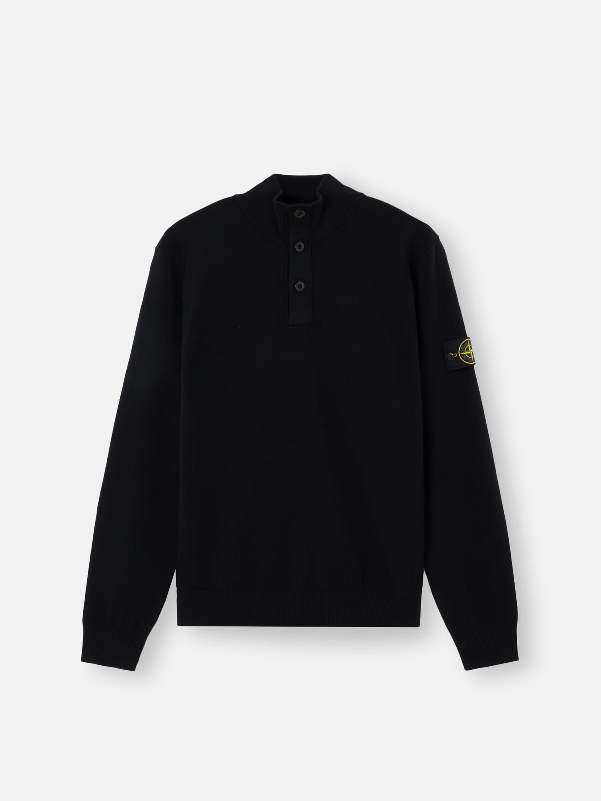 Pull demi-boutonné en maille extensible RWS, avec col montant à trois boutons et bandes à coutures inversées. Jauge 12.