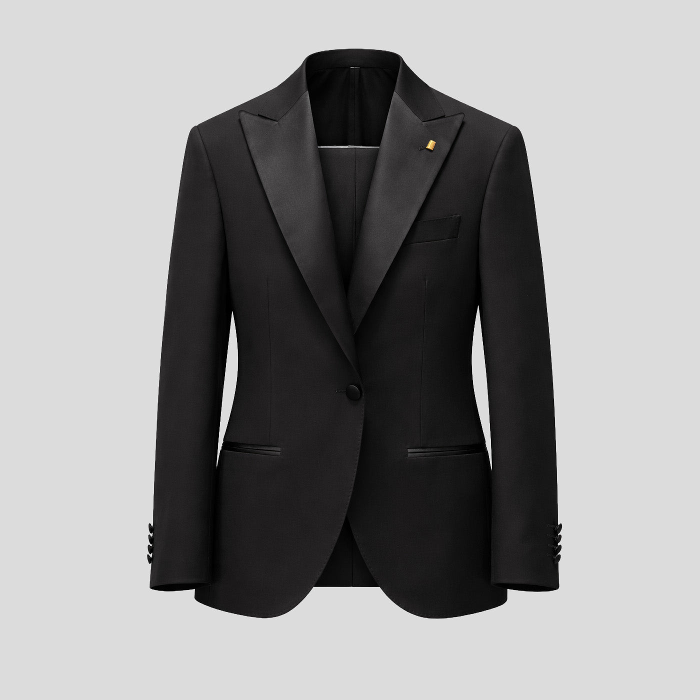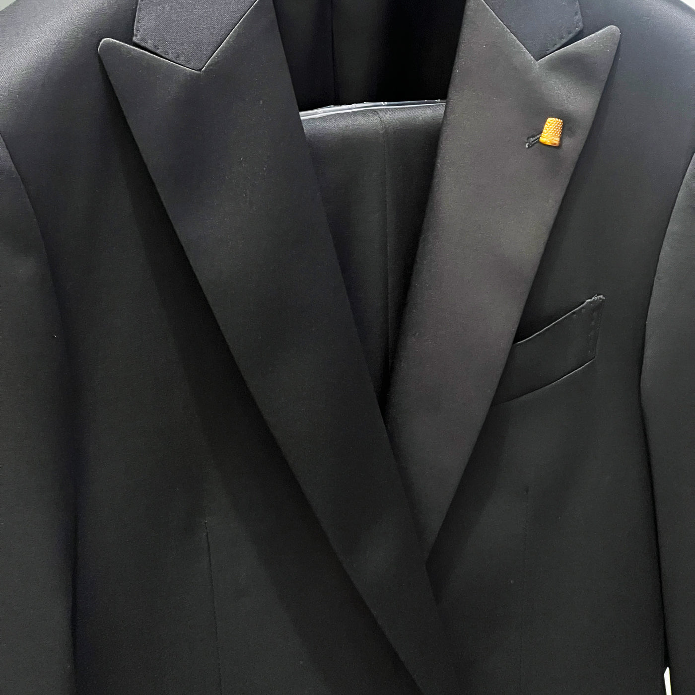 - Fitted cut- Peaked Satin lapels- Two-button closure- Jetted pockets & piped chest pocket
