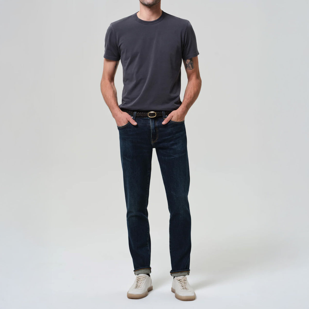 The ‘London’ is a modern slim taper, crafted from cashmere-infused Perform denim for an exceptionally soft and flexible feel. Designed to sit clean through the thigh and taper at the leg, it offers a sharp, balanced silhouette. The indigo wash is lightly faded and whiskered for a lived-in look that elevates everyday wear.