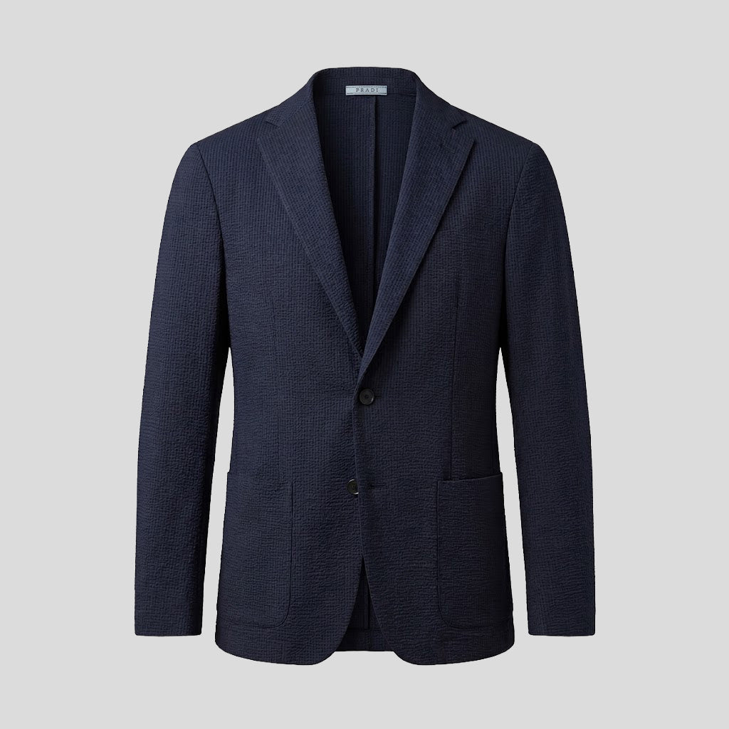 The Fradi Tech Sport Jacket isa performance-oriented blazer designed for travel and active lifestyles. Unlike traditional cotton seersucker, this version utilizes high-stretch "techno" fabrics to provide a modern, wrinkle-resistant fit.